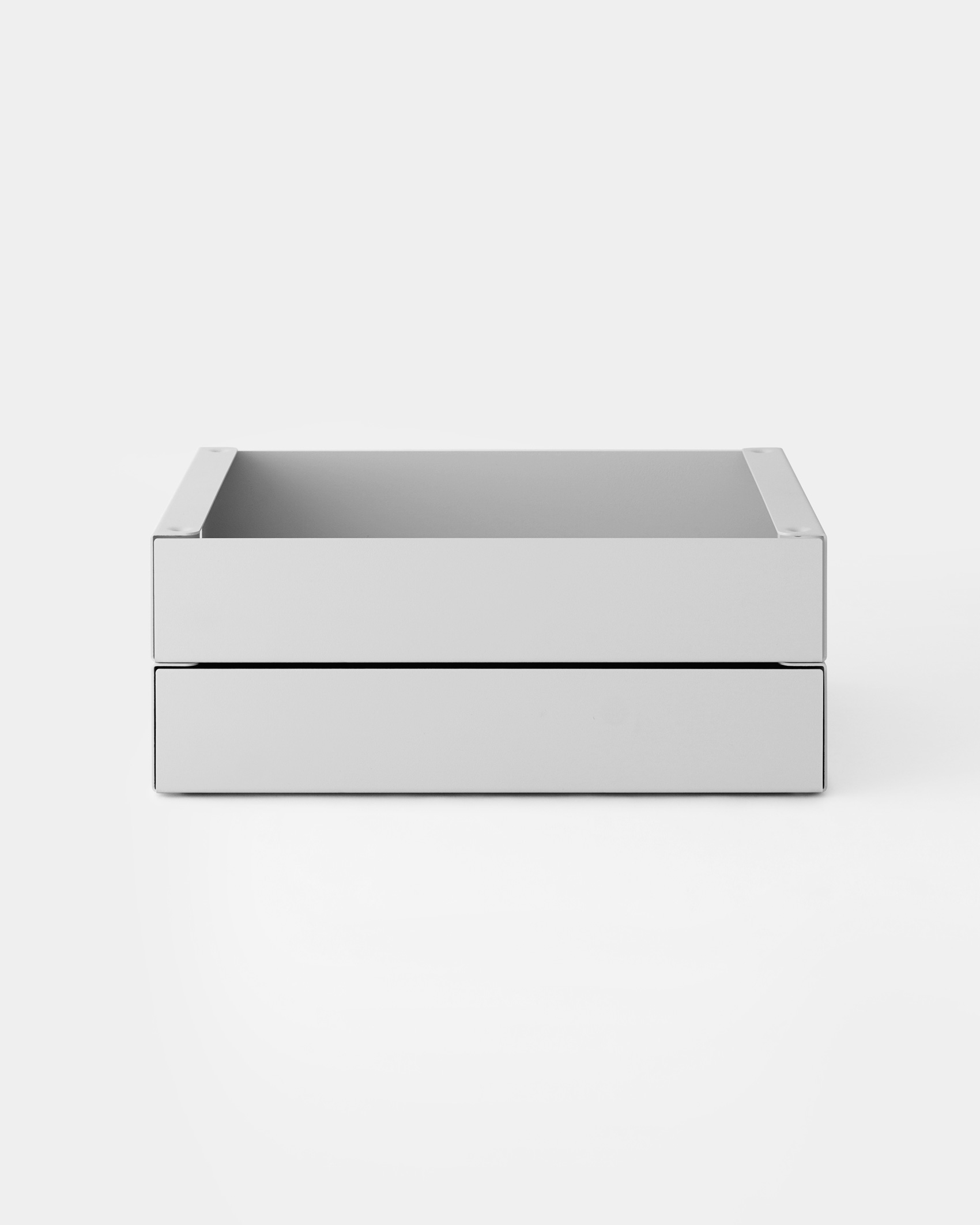 New addition to the UTIL product range, KGT is a simple container made from aluminium. It is a portable serving tray, a stackable storage box and a wall mounted shelf. The project takes its roots from one question: What would be a good storage system? We thought of the simplicity of a crate, the traditional industrial typology for transporting fruits and vegetables. A crate, but that is a bit more home friendly, that would fit nicely in a domestic interior. So what are the essential characteristics of a crate? — a simple container, a box that stacks and that is easily carried.