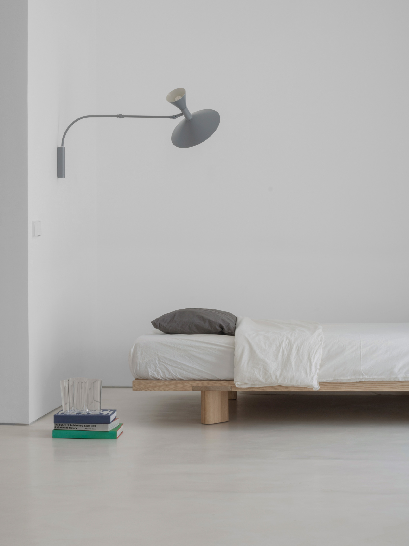 The Unité bed frame is a simple wooden construction that takes reference from architecture, thought like a building raised on pilotis, it is a self-supporting structure formed by columns and beams. Two large timber support equally spaced slats and can accommodate feet that lift up the bed from the floor. The integrated slats provide a soft sprung effect and replace the traditional bed slat kit. They create an airy platform allowing the mattress to be ventilated. The slats assembly to the beams in a half-lap joint manner also allows for a durable structure. Unité comes in two options, helping to create different atmospheres; it can be placed directly on the floor and thanks to the thickness of the beams it still allows the mattress to breathe; it can be configured with four chunky wooden feet for a more traditional typology. Accessories can be added to the frame such as a small folded steel shelf. A shelf that can hold a reading book, a glass of water and other small items.