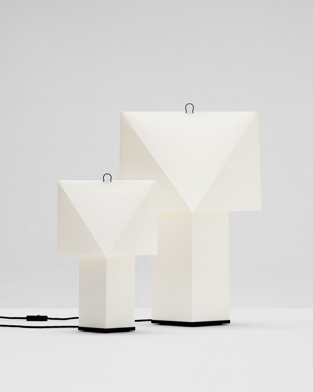 Folds and creases provide both structure and form, and its simple construction, paired with a discreet metal hook and rhombus-shaped base, makes it lightweight and easy to move to wherever light is needed. Its name, taken from the French word for ‘flat’, reflects the transformation of a two dimensional object with precise angles that shape it into a simple, graphic form. Available in two sizes, the Aplat Table Lamp uses a replaceable standard LED bulb, with an inline on-off rocker switch, and can be placed on tables, shelves, and windowsills, while the large size also works comfortably on the floor.