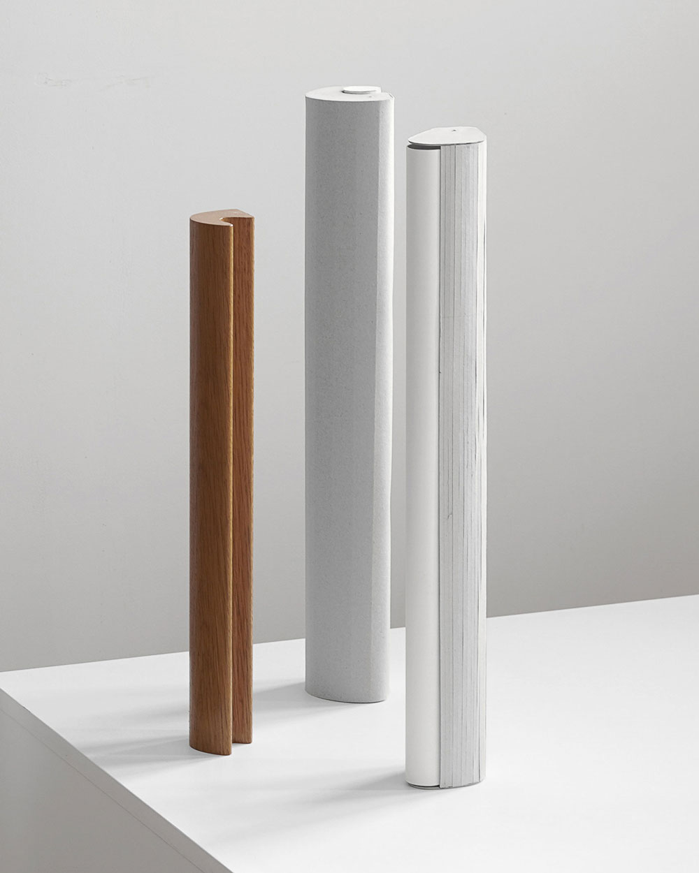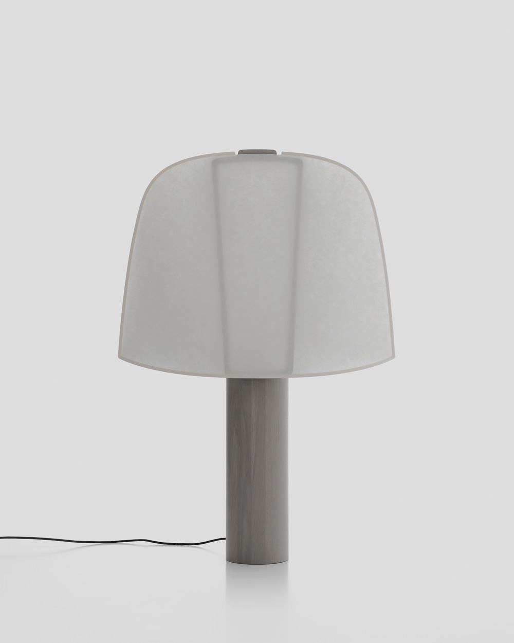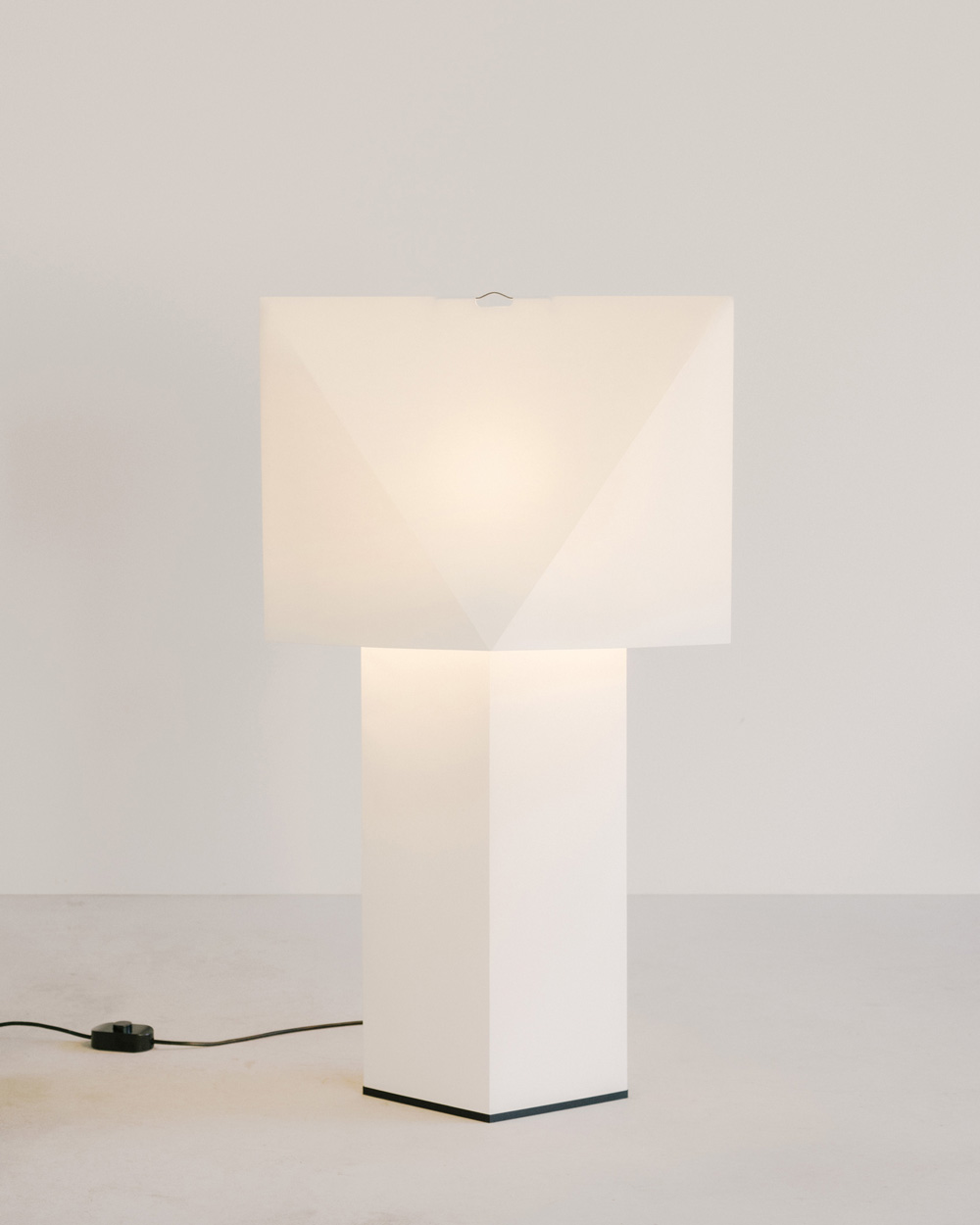 APLAT is a lamp primarily made of paper, its base and shade are folded pieces of lightweight sheets. The use of an honest material such as paper is a fairly simple solution for a lamp. We think that one of the best light atmosphere is often created by simply putting a piece of paper in front of a light source, it produces a beautiful and warm light that reminds us of candle illumination. Here, APLAT uses paper as a light diffuser as well as a product architecture and visual language. Folds and creases are carefully dosed to give the lamp its structure and shape, additional elements, such as foot and handle, are designed to underline secondary functions.
