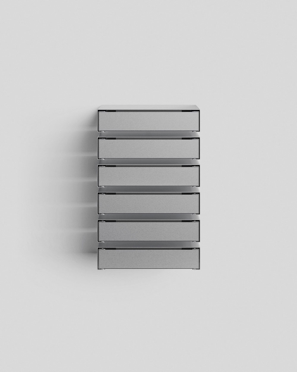 We imagined the KGT Wall Unit as a flexible assembly of elements where KGT storage box becomes drawer; a single drawer shelf unit can change to a 6 drawers cabinet; vertical orientation can turn into horizontal. An unusual design thinking comes into place, where the small dictates the whole. Starting from one element, KGT which was originally designed as a single container, to create a system of blocs, wall mounted drawers and shelves units. Elements can be interchanged, added or moved to offer some level of flexibility and choice. An intended gap left between each drawer offers visual lightness and highlight each of the KGT installed, a reminder that the storage box can still be removed from the unit and used on its own.