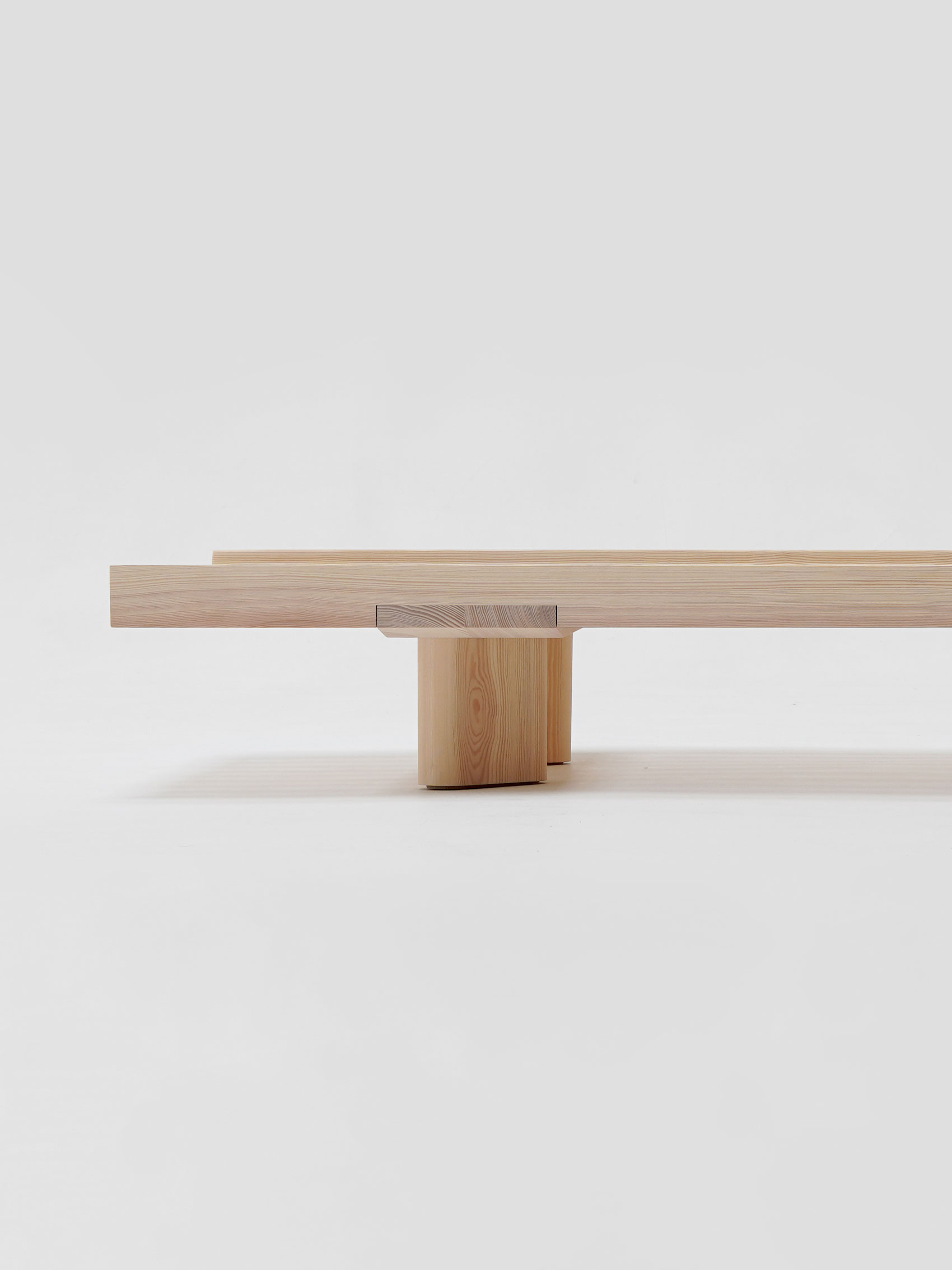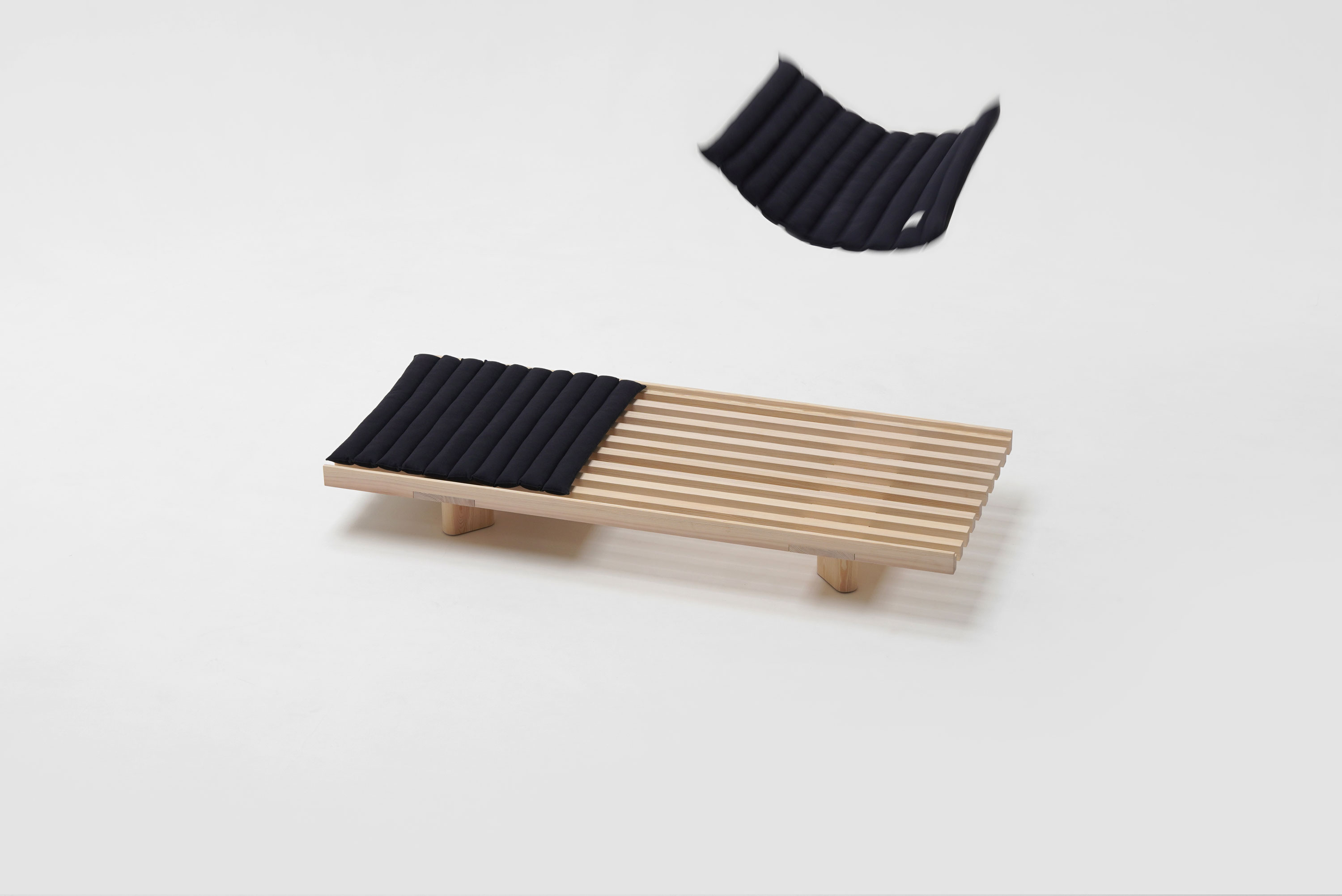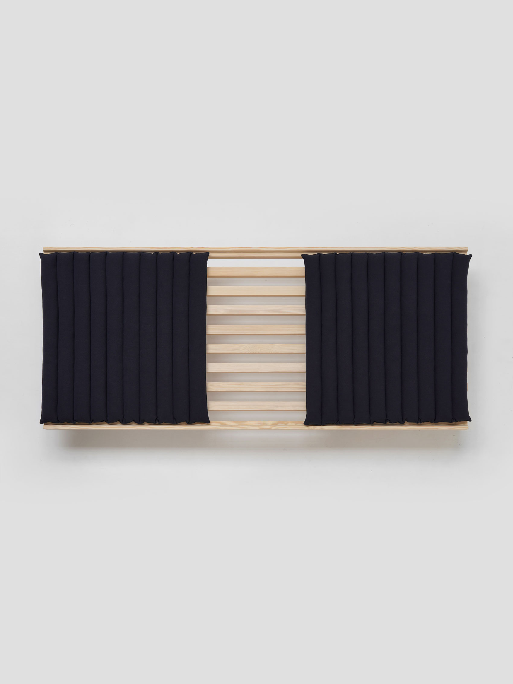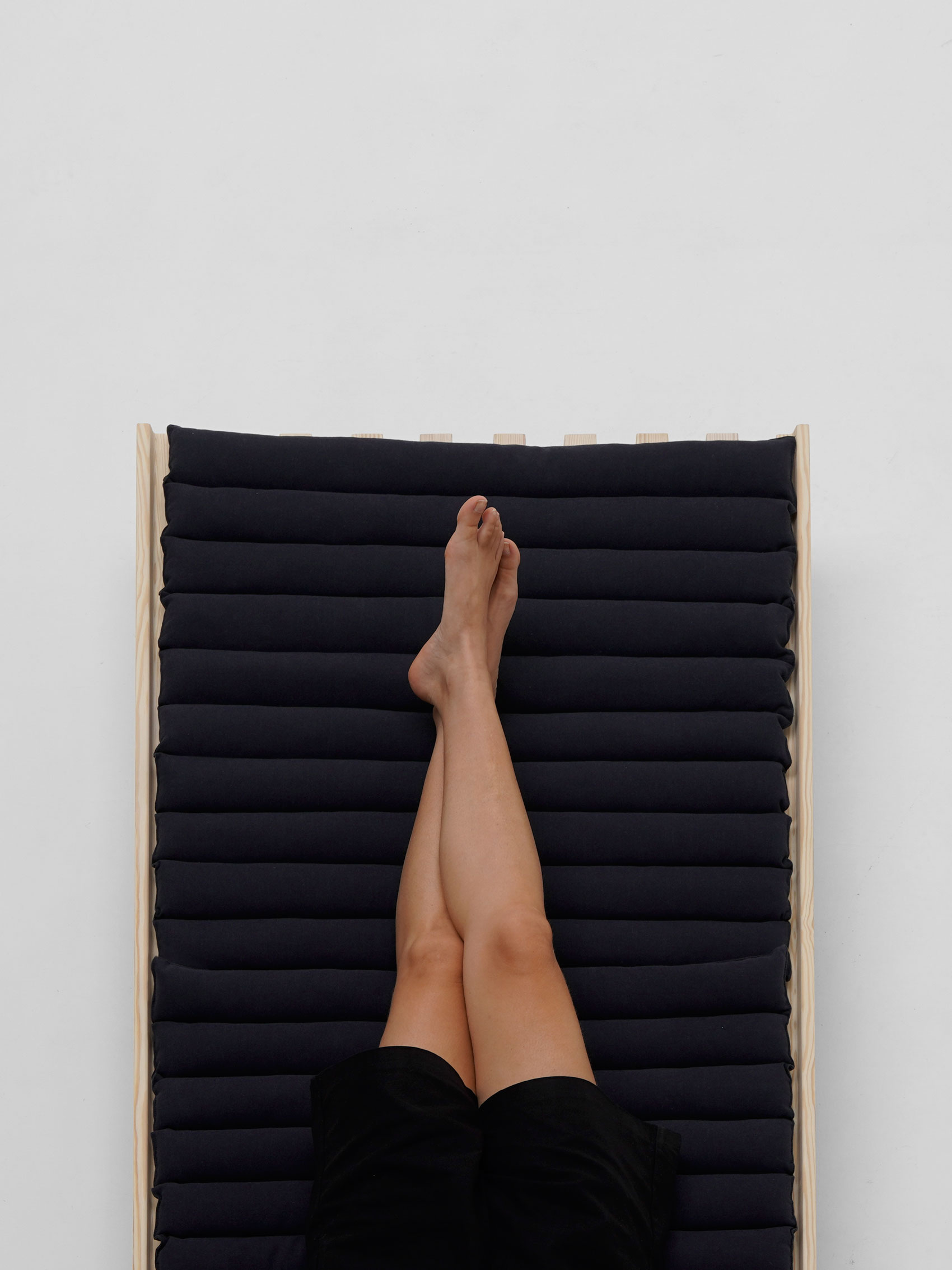 This special version of Unité is a unique piece, with design details that take references from the framed bed of the Korshagehus. Two slats defining the perimeter of the daybed with a curved profile, a slight allusion to the single beds of the house. It can be paired with versatile soft mats designed in collaboration with Azur and made in France from organic fibers. They can be arranged in various configurations such as cushions, headrests, armrests or backrests. We thought the Unité daybed as an open platform for softness, leaving it to users to play and shape their resting space with as many mats and configurations as they wish.