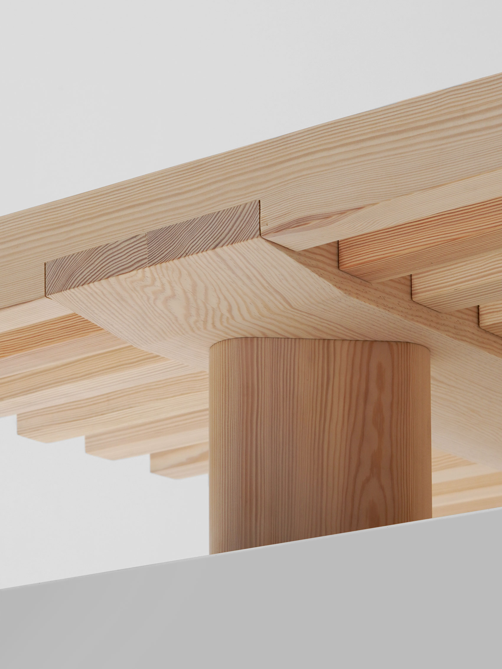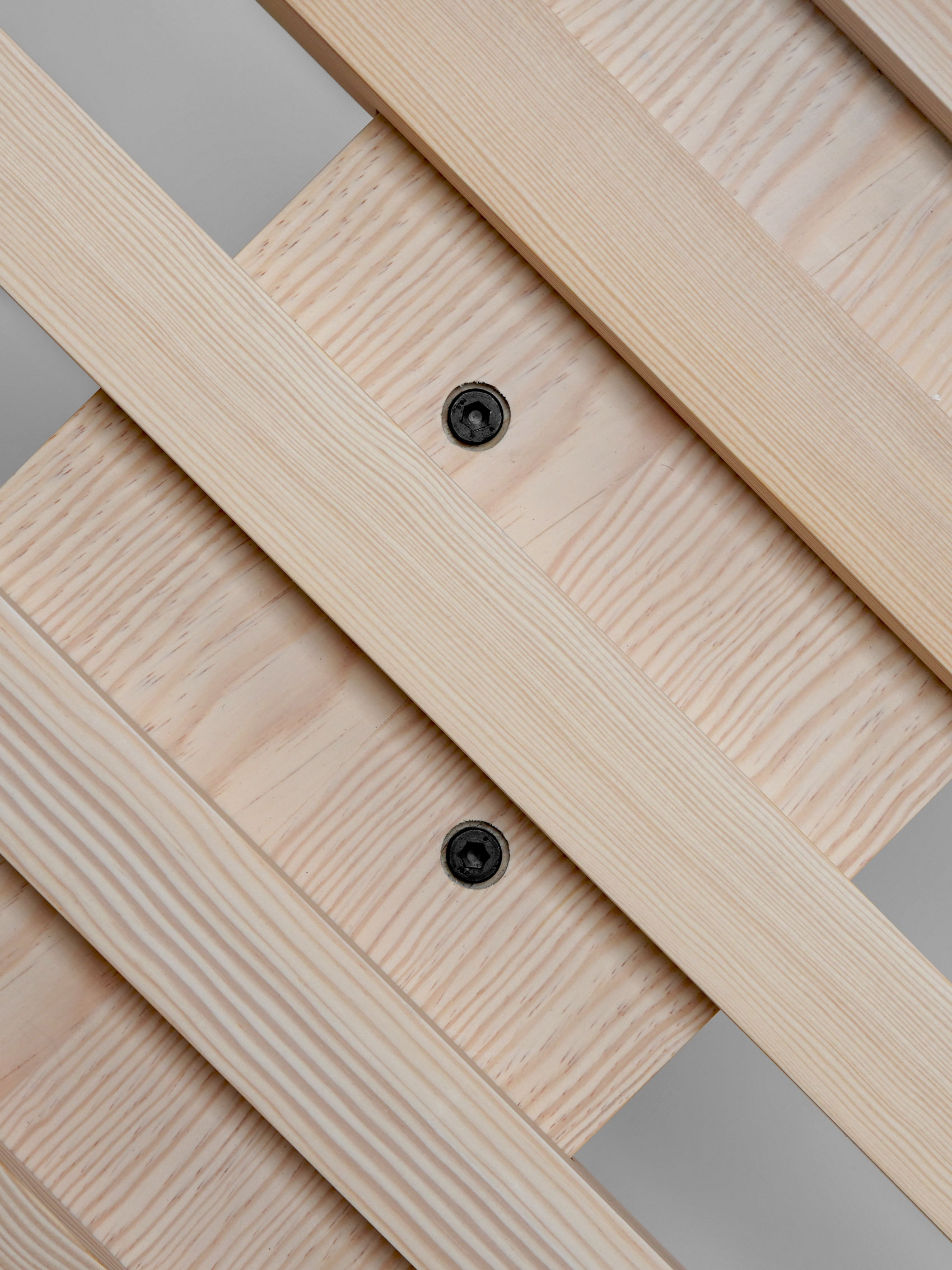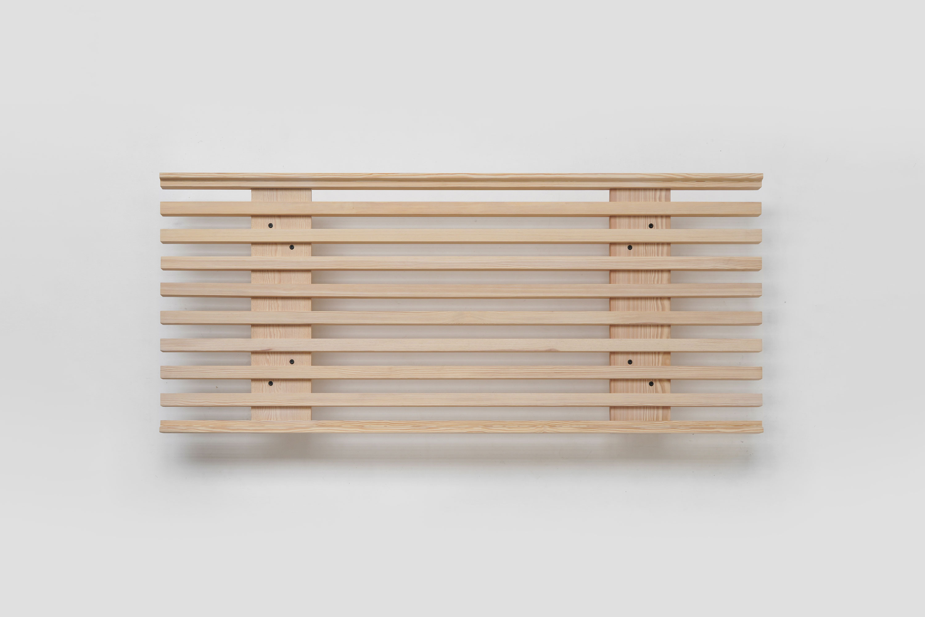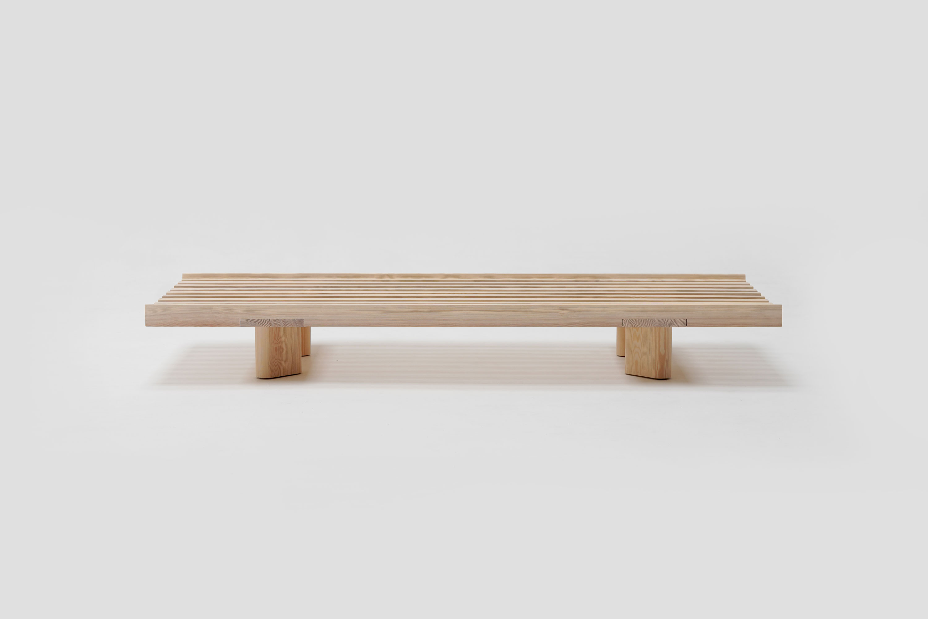 The Unité bed frame is a simple wooden construction that takes reference from architecture, thought like a building raised on pilotis, it is a self-supporting structure formed by columns and beams. Two large timber support equally spaced slats and can accommodate feet that lift up the bed from the floor. The integrated slats provide a soft sprung effect and replace the traditional bed slat kit. They create an airy platform allowing the mattress to be ventilated. The slats assembly to the beams in a half-lap joint manner also allows for a durable structure. Unité comes in two options, helping to create different atmospheres; it can be placed directly on the floor and thanks to the thickness of the beams it still allows the mattress to breathe; it can be configured with four chunky wooden feet for a more traditional typology. Accessories can be added to the frame such as a small folded steel shelf. A shelf that can hold a reading book, a glass of water and other small items.
