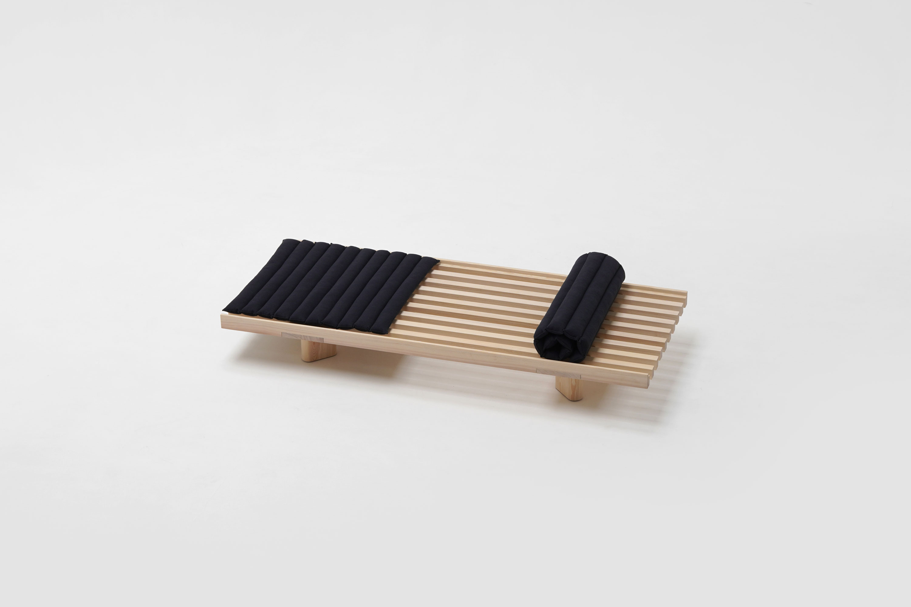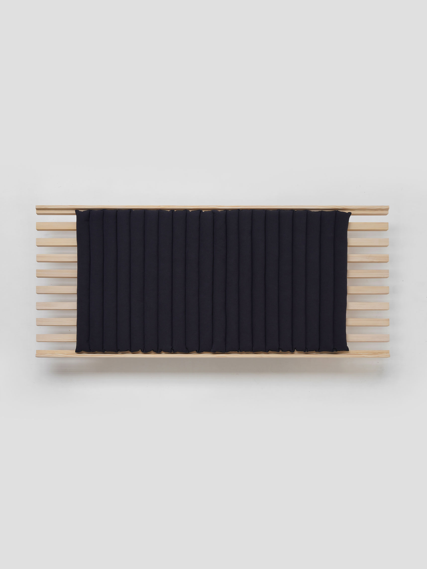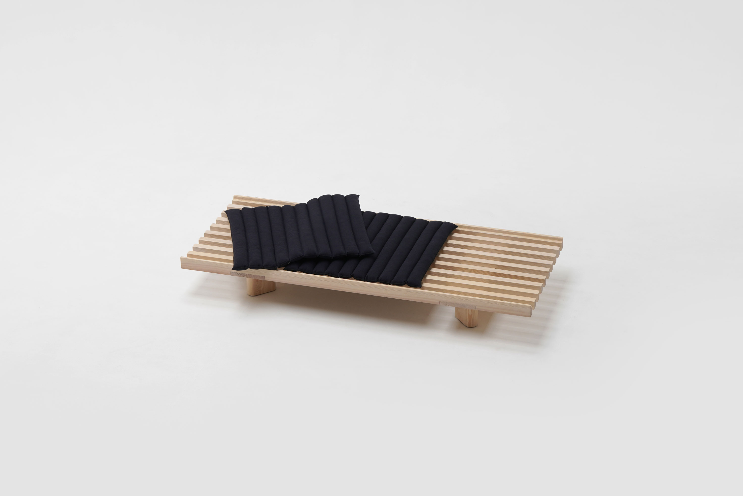 This special version of Unité is a unique piece, with design details that take references from the framed bed of the Korshagehus. Two slats defining the perimeter of the daybed with a curved profile, a slight allusion to the single beds of the house. It can be paired with versatile soft mats designed in collaboration with Azur and made in France from organic fibers. They can be arranged in various configurations such as cushions, headrests, armrests or backrests. We thought the Unité daybed as an open platform for softness, leaving it to users to play and shape their resting space with as many mats and configurations as they wish.